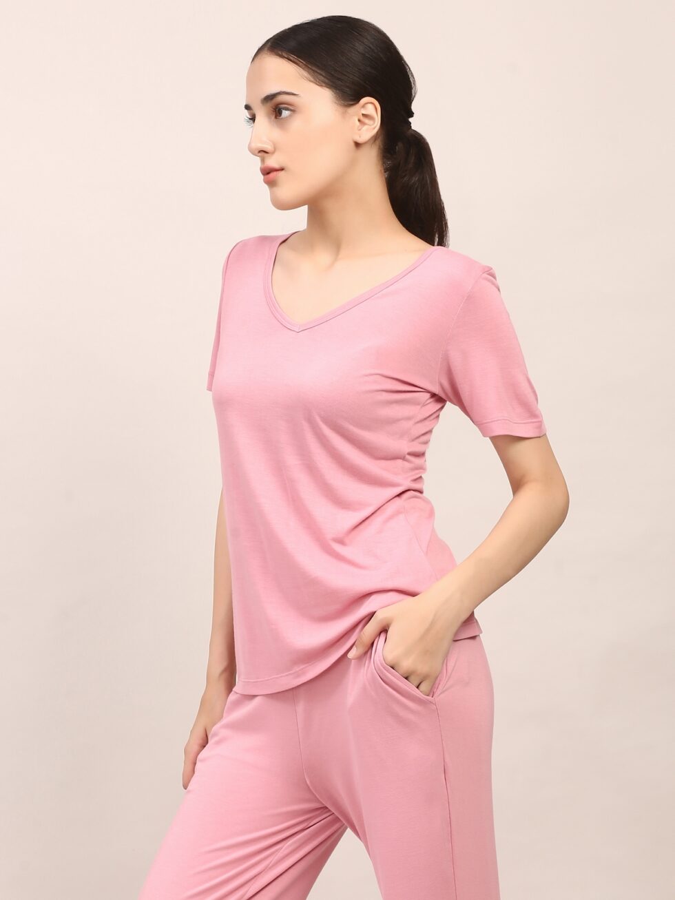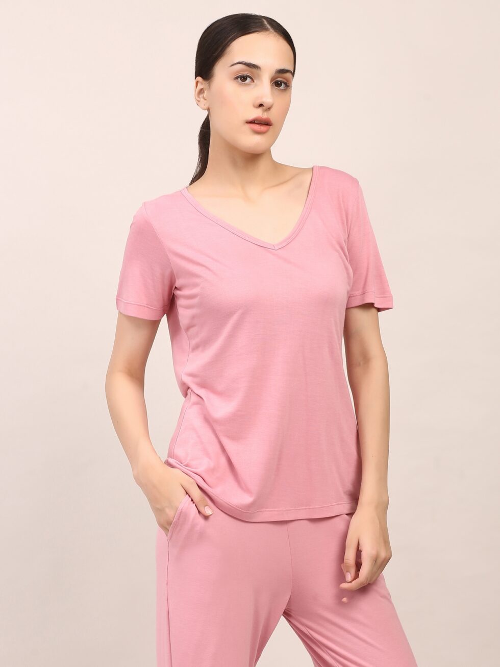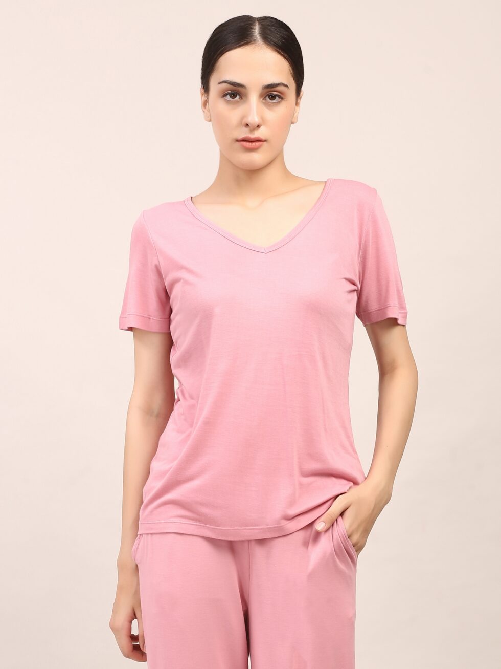 Elevate your everyday essentials with the Nyla Top, crafted from 100% bamboo fiber. Naturally breathable and hypoallergenic, bamboo keeps your skin cool, dry, and comfortable through every move. The V-neckline adds a flattering touch, while the lightweight fabric and easy fit make it ideal for yoga, high-intensity workouts, or relaxed daily wear. A perfect balance of performance and elegance.