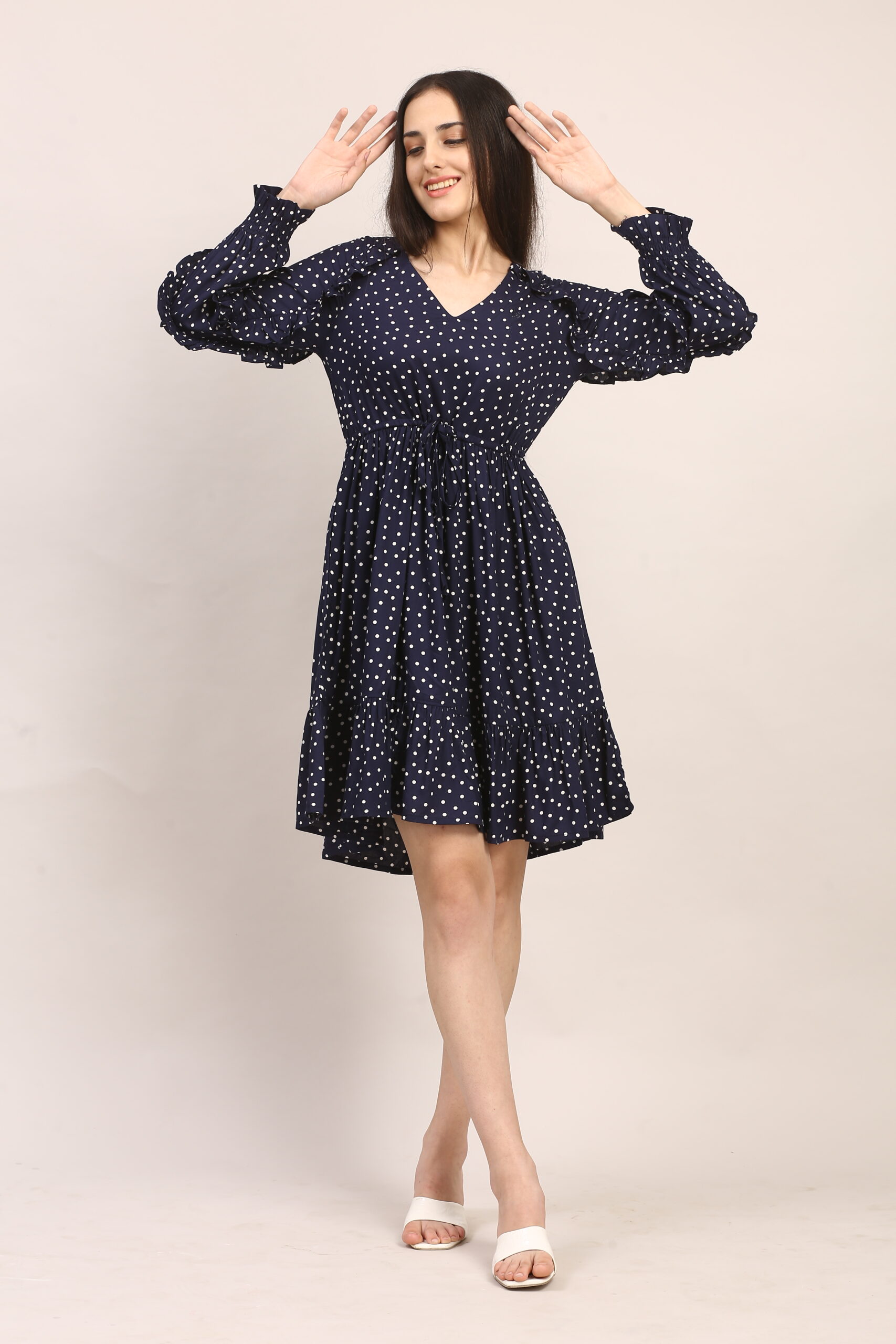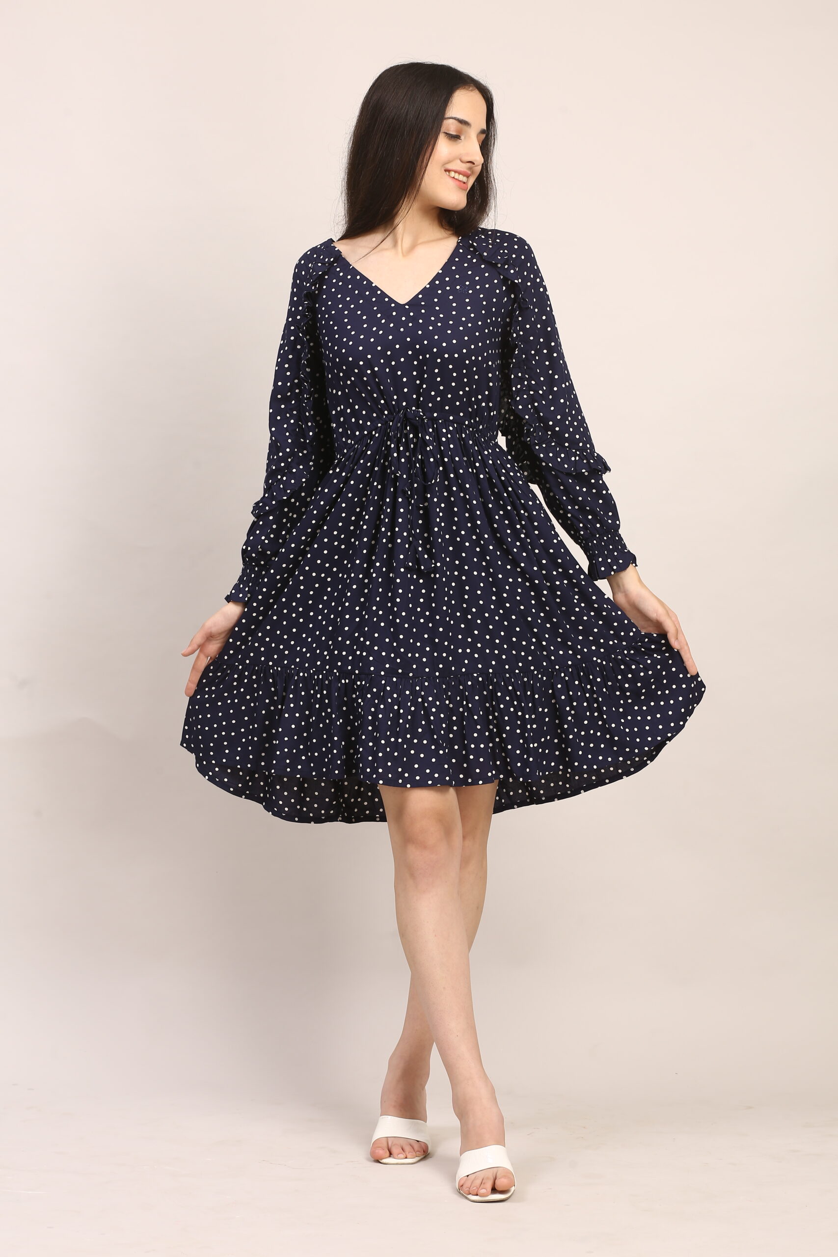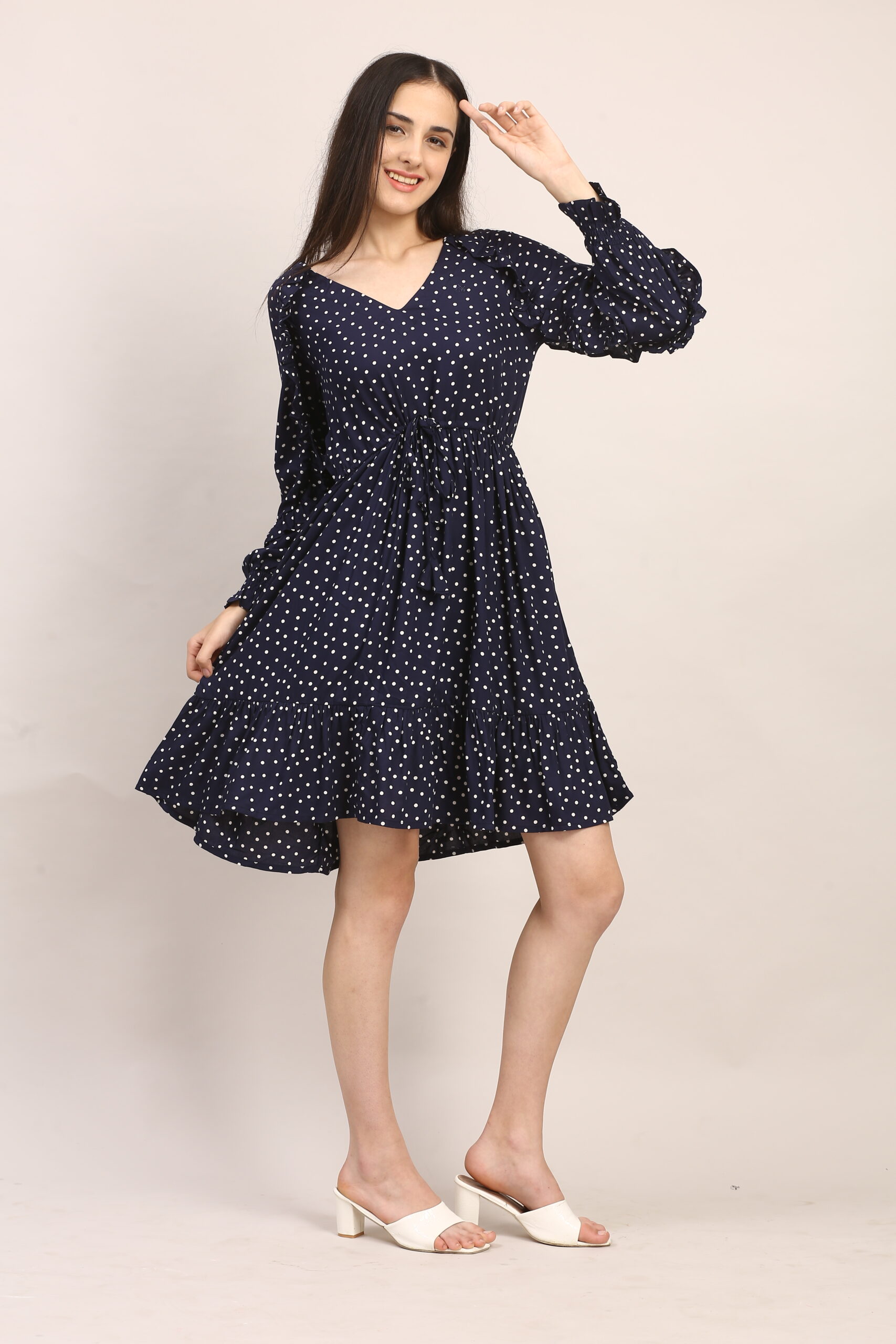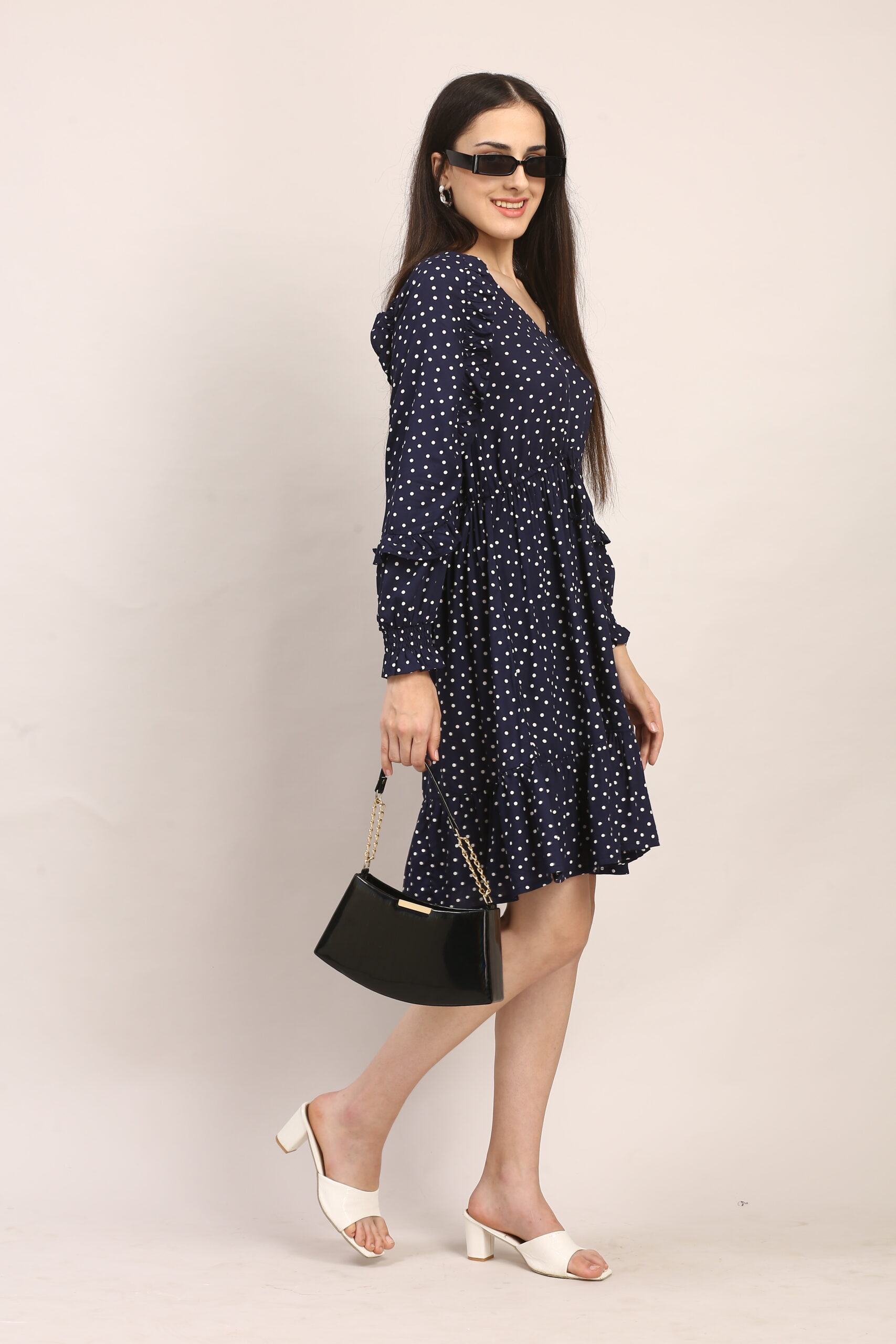 2. For an evening dinner or date, elevate the dress with strappy heels in nude or metallic tones. A statement clutch and bold earrings will draw attention to the neckline and ruffles, while a light shawl or cropped blazer makes it perfect for cooler nights.