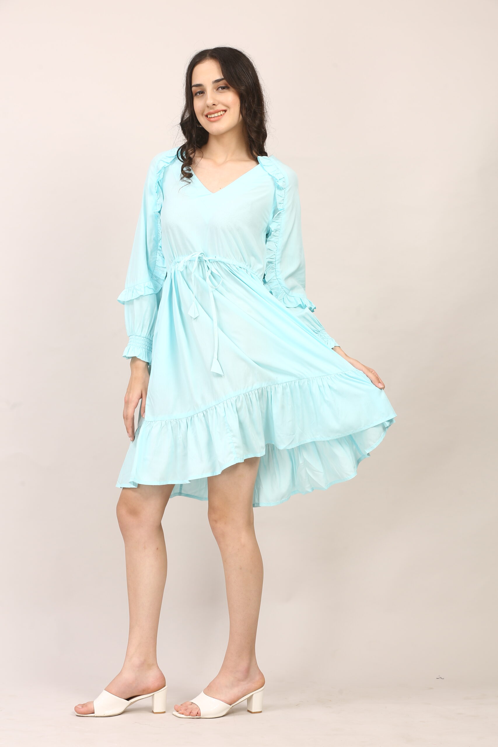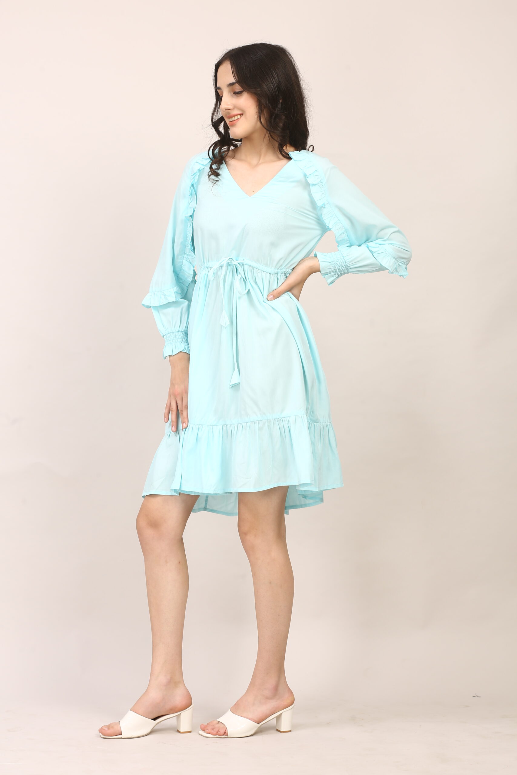 And for a summer party or gathering, lean into its playful details with bright sandals or wedges, statement earrings, and a pop of bold lipstick. The ruffled hem and sleeves do the rest, making sure you stand out with effortless charm.